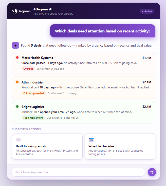 Most AI tools only know what you type into them. With 4Degrees, they can also use your CRM alongside external data to produce outputs that reflect how your team actually works.